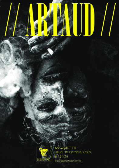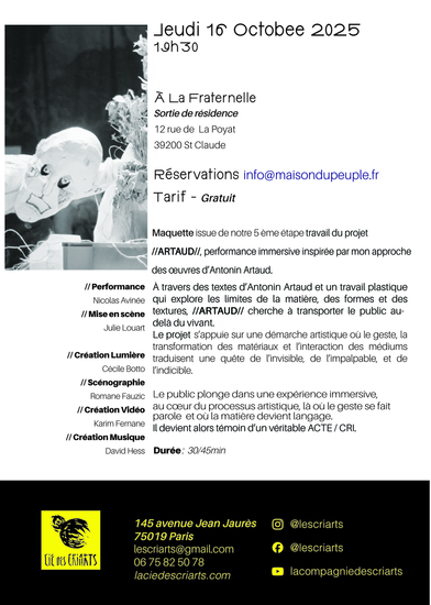 Sortie de résidence // ARTAUD // – La Fraternelle, jeudi 16 octobre 2025 à 19h30 Nous vous invitons à découvrir la 5? étape de travail du projet //ARTAUD//, performance immersive inspirée par Antonin Artaud. Lors de cette résidence, une partie de l’équipe sera présente. Cette étape s’inscrit dans un processus de recherche en plusieurs temps, au cours duquel les différents artistes reviendront progressivement parmi nous. Je travaille un acte de création en direct, en interaction avec la scénographie, le performeur, le créateur sonore, le créateur lumière, le créateur vidéo et moi-même, tandis que le public est immergé au cœur de cette expérience.